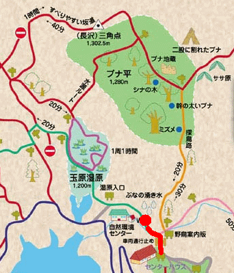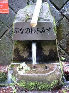 センターハウスから車両通行止めの道路を通って進んでいくとぶなの湧き水が道路沿いにでてきます。 絶えず流れているようでマップ上のぶな平からわきでる水のようです