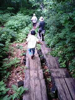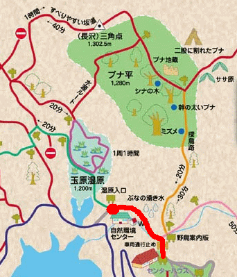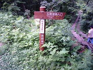 ぶなの湧き水から数分歩くと湿原入り口が見えてきます。